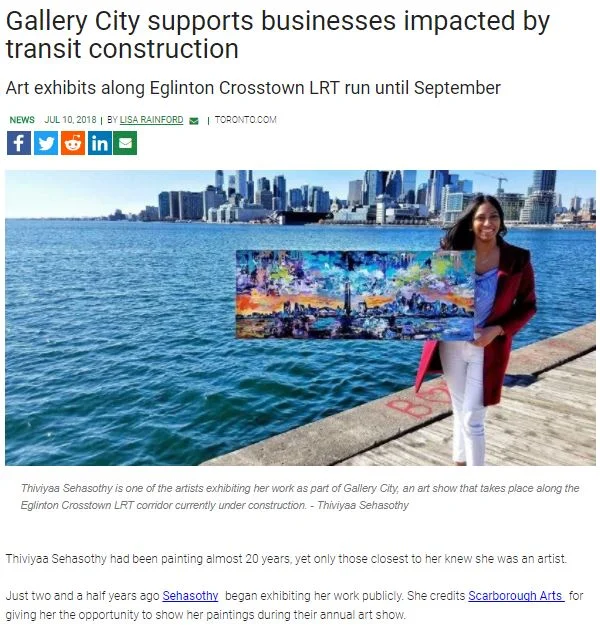Humbled and honoured to share my recent interview with Toronto.com. As one of the artists involved in the City of Toronto's Gallery City exhibition partnered by Metrolinx, Crosslinx Transit Solutions, Eglinton Crosstown, Scarborough Arts.